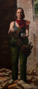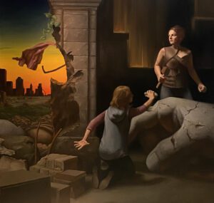 In order to ask these sorts of questions, B.J. Parker set a group of characters in a near future post-apocalyptic St. Louis devoid of society. The characters wander through a dilapidated city, physically working to restructure a ruined landscape of myth. By creating space for these characters to explore a ruined landscape, B.J. is also creating space for the viewer to similarly explore an interior landscape. The paintings reflect snapshots of this post-apocalyptic world while reimagined icons function as artifacts from the future world.