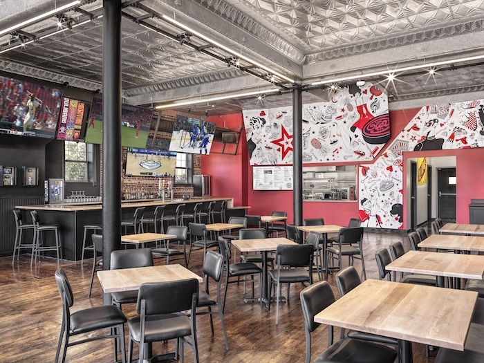 The Key reimagines the spaces for the modern day, while respecting and preserving their defining architectural elements. An original tin ceiling in the Burger Bar has been restored and given a fresh coat of silver paint and the soaring original wood trusses in the Boogie have been carefully preserved and restored. KAF worked with Chandler Ahrens, co-founder of Open Source Architecture and an Associate Professor of Architecture at Washington University in St. Louis, to design the space and Harambee LLC to lead the construction.